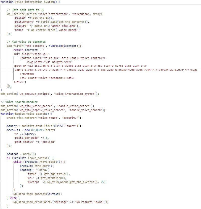 Plenty of AI tools have voice modes that let you seamlessly interact with them. Adding voice commands to your own site is also worth exploring. To do this, you are going to need to know a bit of PHP and JavaScript. For starters, you need to add the following code to your functions.php file.