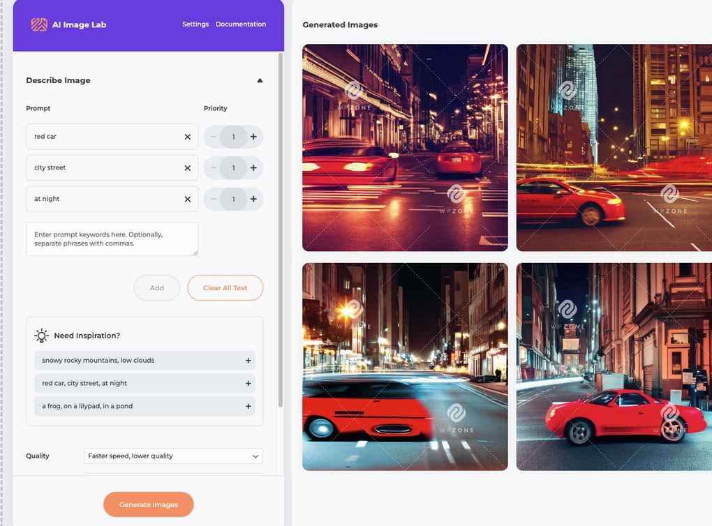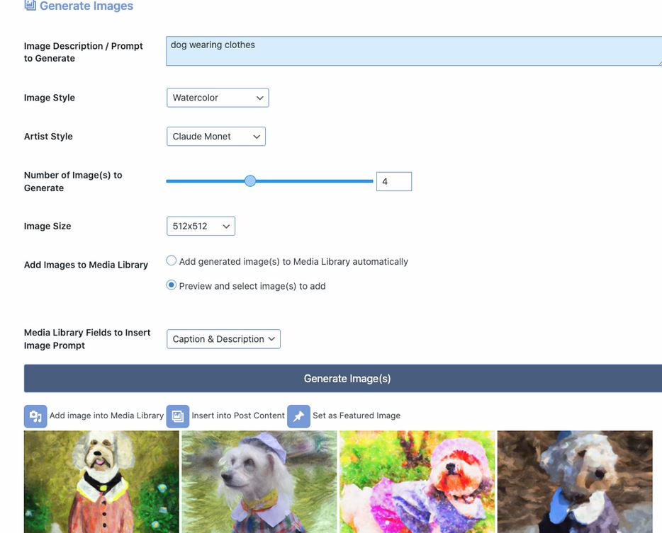 Artist Image Generator: another OpenAI powered image generator for WordPress that creates images from scratch from text prompts. It can also generate variations. Lets you easily add images to the media library.