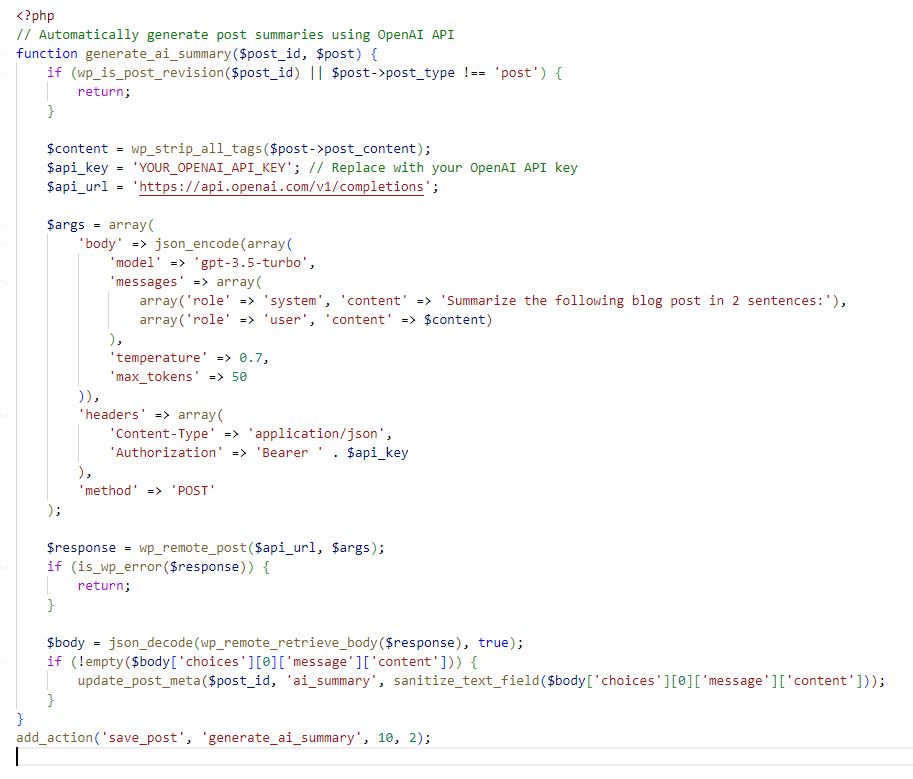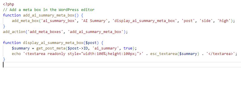 When you publish or update a post, OpenAI’s API is used to create a 2-sentence summary of your work. It is saved as a custom field. You can use this code snippet to add the appropriate meta box to the WordPress editor: