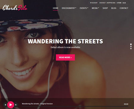 Chords: an entertainment theme for artists, bands, event organizers, and radio stations. It comes with a sophisticated track and discography management system. Chords has 6 custom post types and 16 color schemes. It has a Shoutcast & Icecast stream music player.