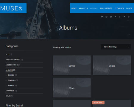Muse: a mobile friendly theme for music bands, radio stations, and DJs. It lets you maintain an online shop to sell merchandise and albums. The theme is fast, responsive, and ready for Retina displays. It comes with slideshow and album management.