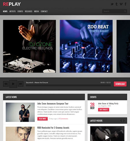 Replay: comes with a HTML5 audio player to play your mp3 files. It is responsive and has 7 widgets and 6 custom post types. It has an events manager too.