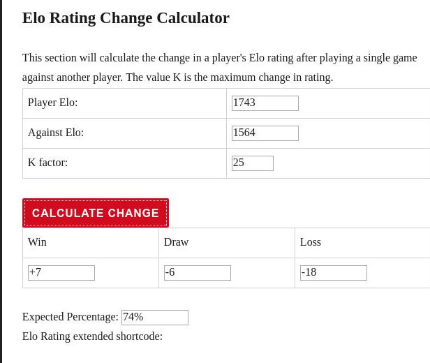 Elo Rating Shortcode: this is a lightweight chess ELO widget that uses JavaScript for calculations. You simply have to enter your ELO and k-factor information to calculate changes.