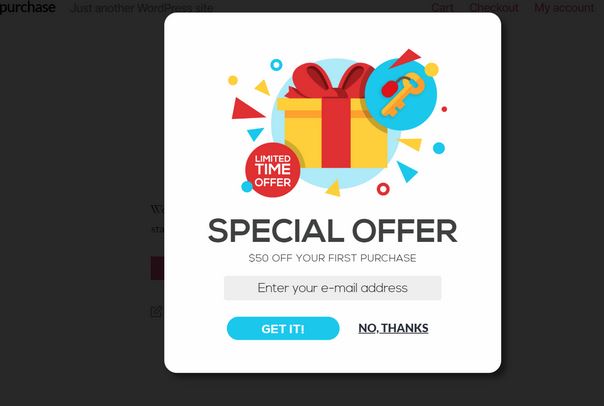 WooCommerce First Purchase Discount Promotion: a handy plugin that shows your first time customers a pop-up with a coupon to save time money and encourage them to complete their purchase.