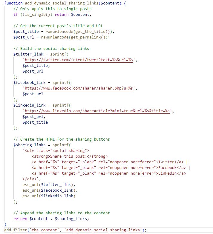 This is a basic implementation but with Font Awesome or other icon libraries, you can add icons to your sharing buttons. This code automatically updates for your posts, so you don’t have to manually change anything. For styling, you can use basic CSS rules.