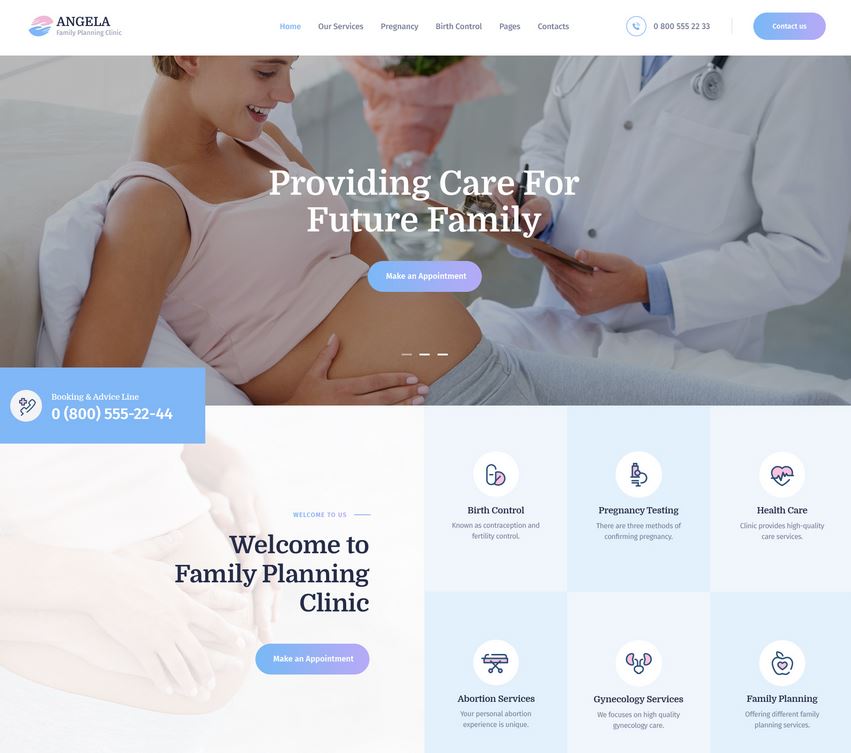Angela: a modern family planning clinic theme with a fully responsive design and drag & drop layout builder. It is compatible with Slider Revolution, Essential Grid, and Booked Appointments. It has parallax backgrounds.