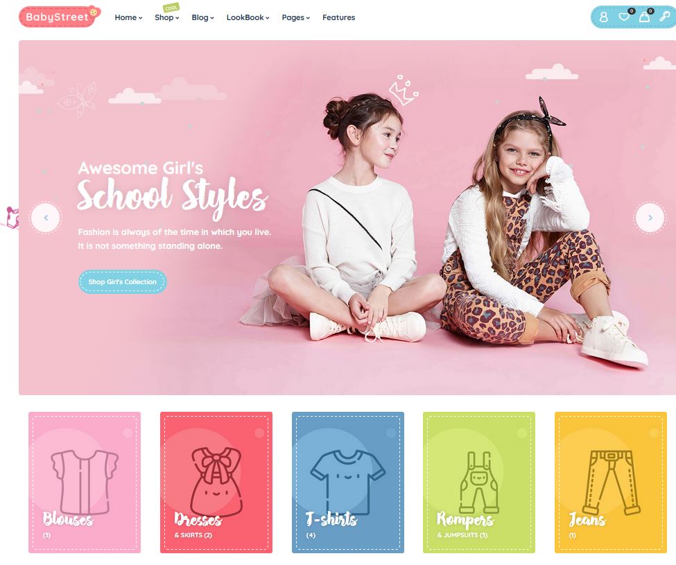 BabyStreet: a WooCommerce theme for kids toys and clothes shops. It has various homepage designs pre-built. It comes with 3 gallery types and Lookbook functionality. It has off-canvas shopping cart and search functionality. BabyStreet also has a custom mega menu system.