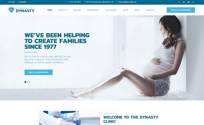 Dynasty: a reproduction clinic WordPress theme with a responsive design. It has a drag & drop pagebuilder with over 25 modules. It has a convenient appointment manager and various useful custom shortcodes. It is powered by the Cherry Framework 5. It is Ecwid ready.