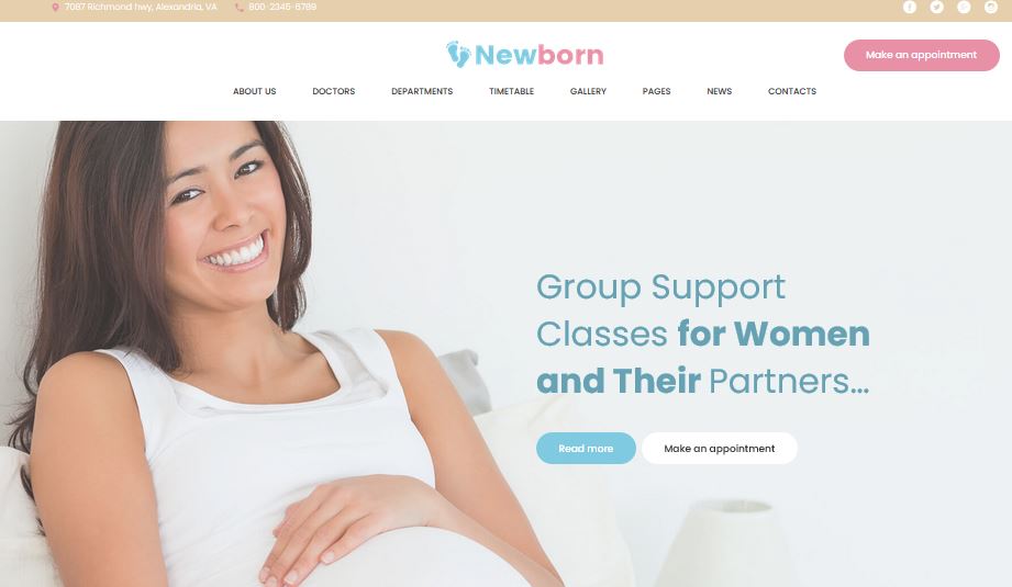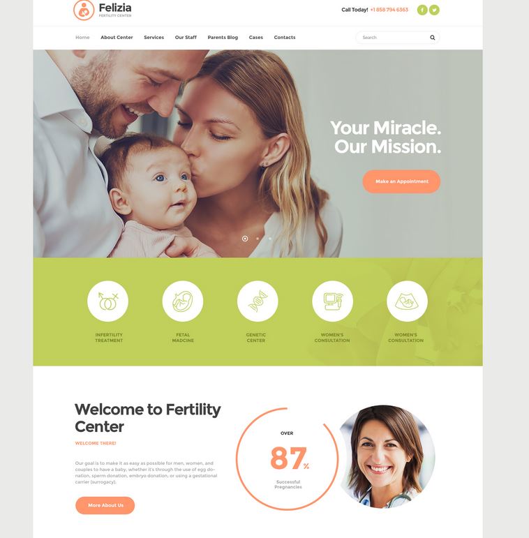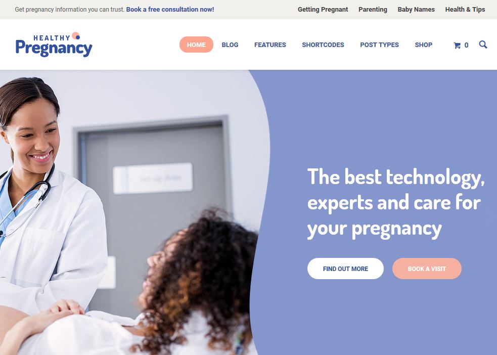 Felizia: another WP theme for pregnancy centers and gynecologists. It has 4 homepage layouts. It is responsive and has interactive Ajax search. It is compatible with WPBakery pagebuilder. It comes integrated with Google Fonts.