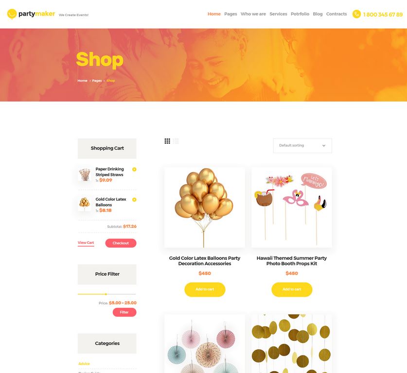 PartyMaker: a WordPress theme for all kinds of fun events, including weddings and birthdays. It has premade pages for products, services, blogs, and contacts. It is compatible with WPBakery pagebuilder. It supports mega & sticky menus.