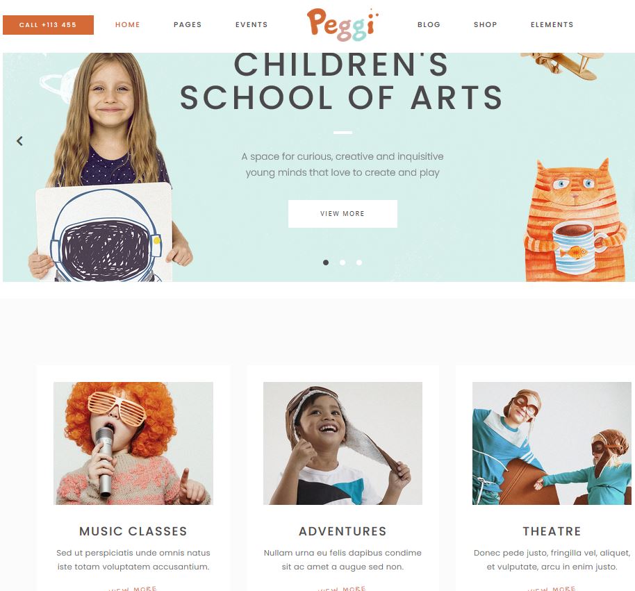 Peggi: a multipurpose WordPress theme for kindergartens, babysitters, daycare homes, and other comparable businesses. It is fully responsive and ready for Retina displays. It has 3 customizable header types and multiple shop & blog layouts. It integrates with WooCommerce.