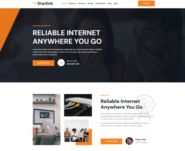 Starlink Broadband has a one-page layout. It comes with everything you need to promote your prices, services, blogs, and testimonials. It has a lightweight design, so it loads pretty fast. Useful for small businesses in the telecom industry.