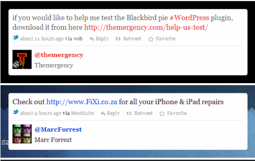 Dress up your tweets: want to add tweets to your blog posts in a more attractive fashion. Twitter Blackbird Pie for WordPress has you covered. It supports web intentions.