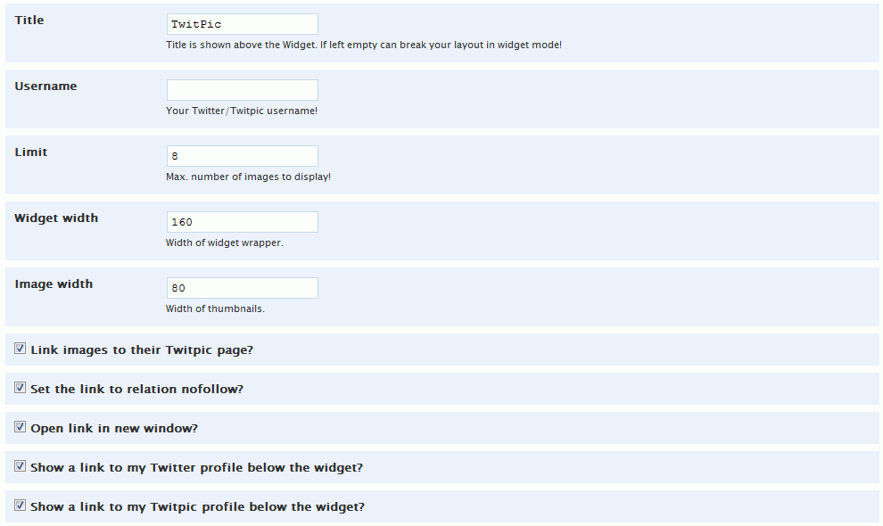 Add your TwitPic pictures to WordPress: TwitPic for WordPress lets you show your latest pictures from TwitPic in your sidebar.