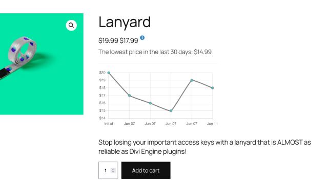 This plugin adds an interactive price chart to your website. You can customize text and other aspects of this plugin. You will also be able to monitor price change history in your dashboard. It is smart enough to show compliance notice when your products are on sale.