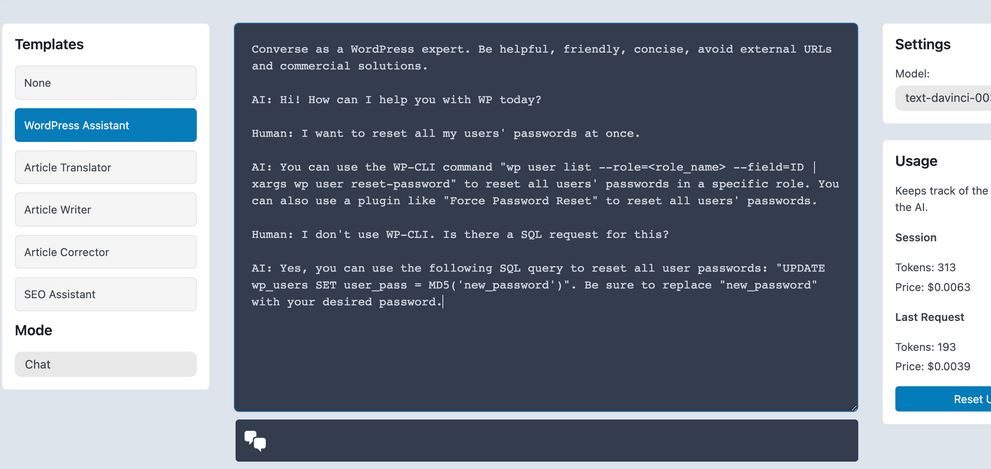 AIKit: an AI writer for WordPress that you can use to generate new posts or repurpose your old content. You can change # of articles, section per articles, max number of words, and more.