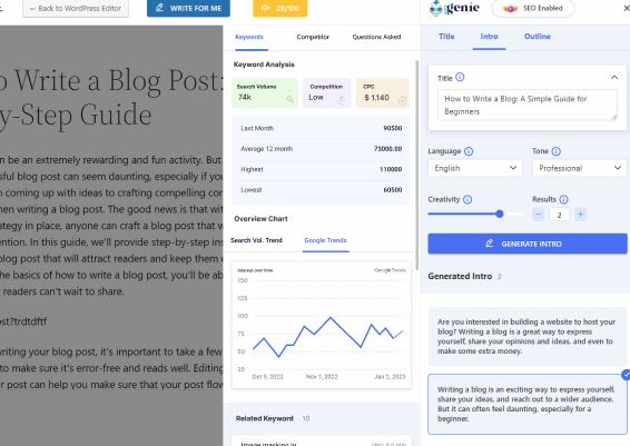 GetGenie: this AI writer for WordPress comes with over 37 writing templates. It supports over 33 languages. It has an AI chatbot with over 22 personalizes. It has plagiarism detector integrated.